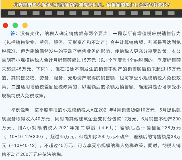 第一個問題:小規模納稅人起征點月銷售額標準提高以后,銷售額的執行口徑是否有變化?