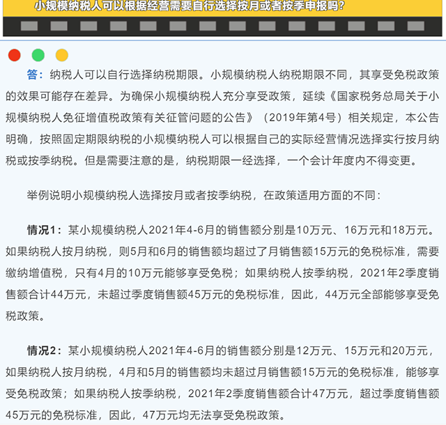 第二個問題:小規模納稅人可以根據經營需要自行選擇按月或者按季申報嗎?