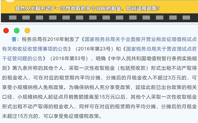 第三個問題:自然人出租不動產—次性收取的多個月份的租金,如何適用政策?