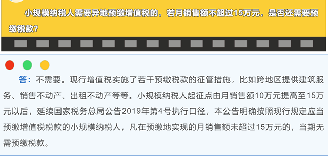 第四個問題:小規模納稅人需要異地預繳增值稅的。若月銷售額不超過15萬元。是否還需要預繳稅款?
