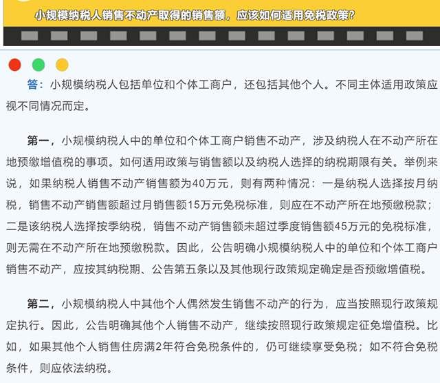 第五個問題:小規模納稅人銷售不動產取得的銷售額,應該如何適用兔稅政策?